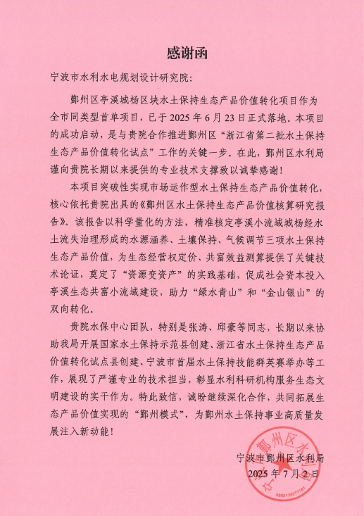 鄞州區(qū)水利局在感謝信中特別指出,我院提供的技術(shù)支持不僅專業(yè)高效,更體現(xiàn)了強(qiáng)烈的責(zé)任意識(shí)和服務(wù)意識(shí)。信中高度贊揚(yáng)了水保中心團(tuán)隊(duì),特別是張濤、邱豪等同志,在相關(guān)工作中展現(xiàn)的嚴(yán)謹(jǐn)務(wù)實(shí)的工作作風(fēng)、精益求精的專業(yè)態(tài)度,以及不辭辛勞的奉獻(xiàn)精神。這份肯定不僅是對(duì)項(xiàng)目組的褒獎(jiǎng),更是對(duì)我院全體職工莫大的鼓舞和激勵(lì)。