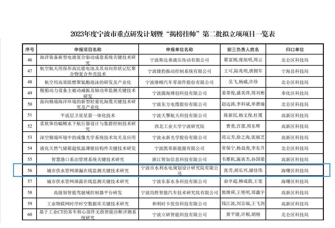 此前,我院“城市供水管網(wǎng)泄漏在線監(jiān)測關(guān)鍵技術(shù)研究”已入選寧波市重點研發(fā)計劃暨“揭榜掛帥”第二批擬立項項目。兩個項目合同總經(jīng)費達(dá)4000萬元。