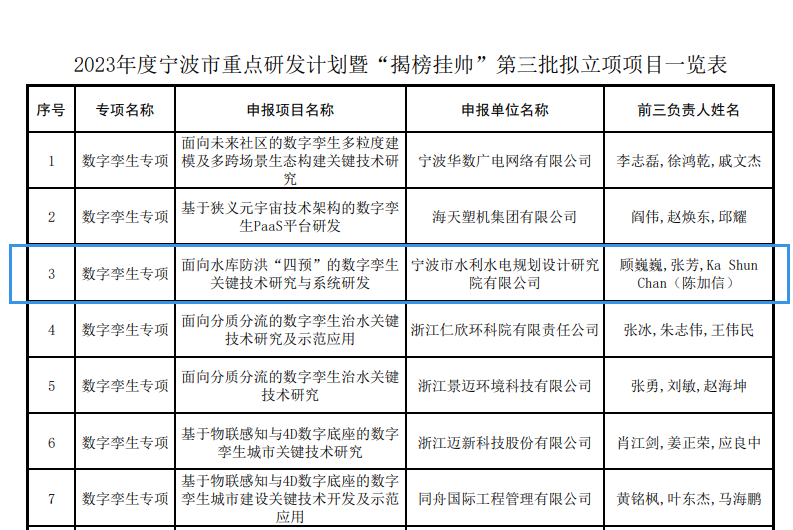 近日,2023年度寧波市重點研發(fā)計劃暨“揭榜掛帥”第三批擬立項項目公示,我院“面向水庫防洪‘四預(yù)’的數(shù)字孿生關(guān)鍵技術(shù)研究與系統(tǒng)研發(fā)”項目成功上榜。
