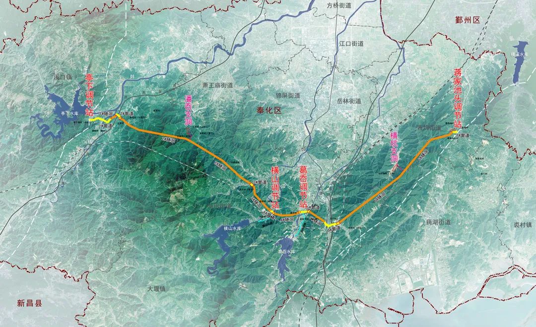 作為浙江省重點(diǎn)水利工程建設(shè)項(xiàng)目,寧波市水庫群東西線聯(lián)通工程位于寧波市奉化區(qū)南部山區(qū),工程設(shè)計輸水規(guī)模為40萬m3/d,項(xiàng)目投資約20億元。建設(shè)內(nèi)容包括一條干線、兩條支線,沿線調(diào)節(jié)站及各類閥井。全線總長約40.54km,其中干線長約36.76km,隧洞長度約31.09km,管道長度約5.67km,橫山支線長約1.45km,葛岙支線長約2.33km;新建4座調(diào)節(jié)站,分別為新建亭下調(diào)節(jié)站、橫山支線調(diào)節(jié)站、蔣家池頭調(diào)節(jié)站、葛岙支線調(diào)節(jié)站;新建各類檢修閥井若干。工程等別為Ⅲ等,工程規(guī)模為中型。主要建筑物如輸水隧洞、輸水管道及調(diào)節(jié)站等建筑物級別為 3 級。洪水重現(xiàn)期為 30 年一遇洪水設(shè)計,100 年一遇洪水校核。